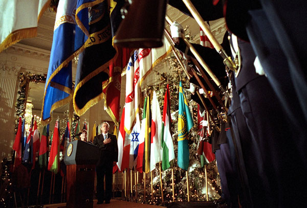 | December 11, 2001 | December 12, 2001 | December 14, 2001 | December 17, 2001 | photo credit: Eric DraperThere are tons of flags on this 9/11 memorial day. Bush has his hand over his heart, obscuring the lapel. |