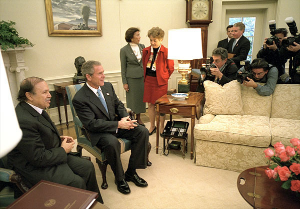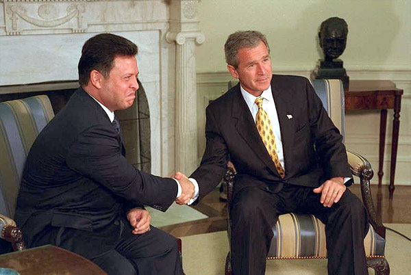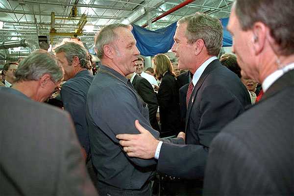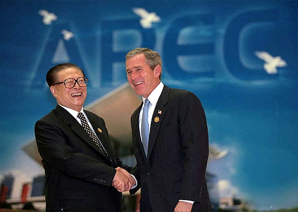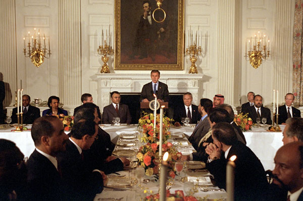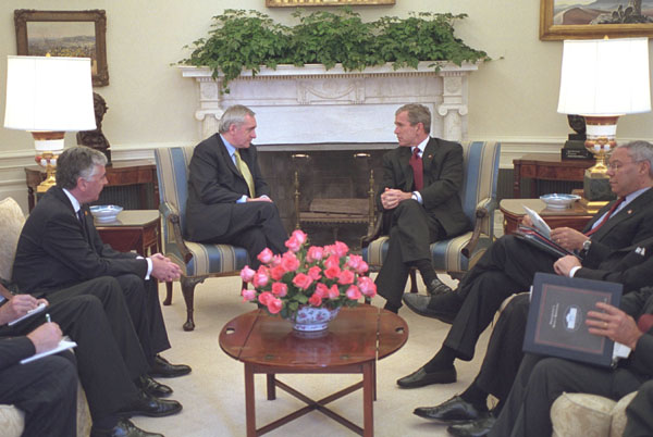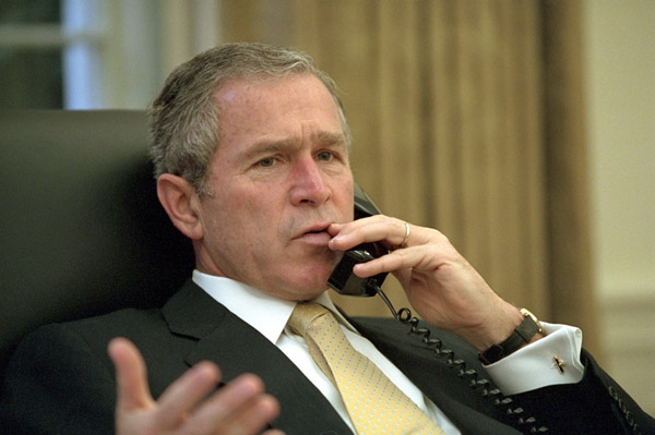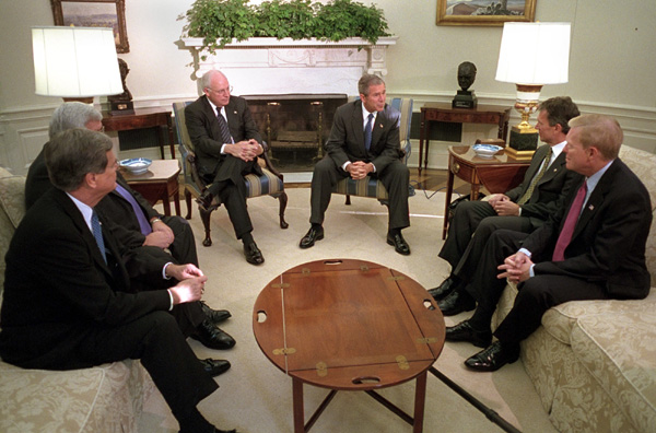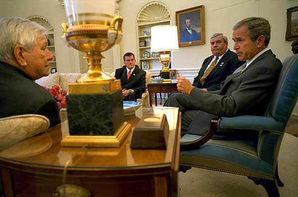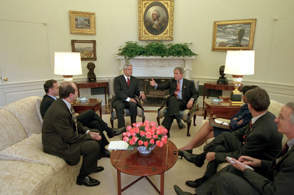 photo credit: Eric DraperThis photo is from the October 19th summit. It was included in a press release the next day. Bush is wearing two pins here. |