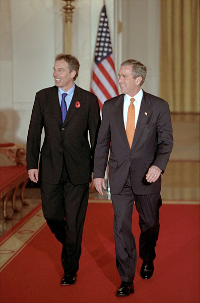 photo credit: Paul MorseBlair is wearing a Poppy on his lapel. Bush is wearing a flag pin. |
