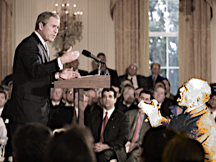 The image of George W. Bush is from the [archived White House Homepage] from the GWB administration. There is no credit to the photo captioned: "President Bush speaks to small business owners in the East Room of the White House"; dated 16 March 2001.